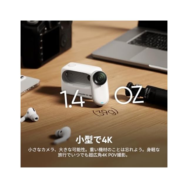 1.4oz (39g) & 親指サイズ - Insta360 GO 3Sは、わずか1.4oz (39g)の小型で高性能な4Kビデオカメラ。小さくてもパワフルなパッケージで、高画質の映像を。