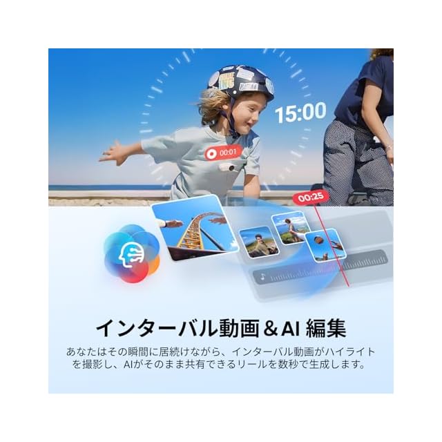 AI編集 - 自動編集がハイライトを見つけ、音楽に合わせた動画に編集します。フリーフレーム動画で撮影すれば、どのソーシャルプラットフォームでもどのようなアスペクト比でも簡単に共有できます。