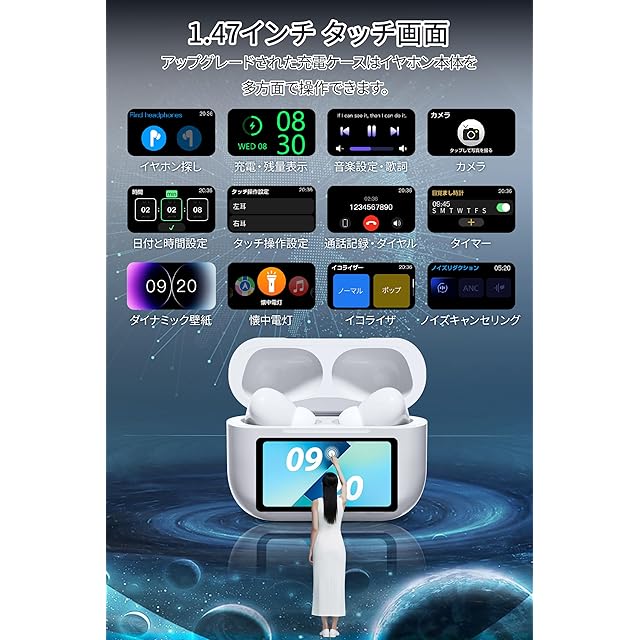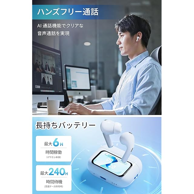 【革命的な1.47型タッチスクリーン充電ケースで操作を一元化】 業界初の多機能タッチスクリーン搭載充電ケース。画面でバッテリー残量や日付・時刻を直感的に確認。専用画面から音量調整/曲送り/曲戻し/停止などの音楽操作もワンタッチ。耳検出機能により、装着・外すだけで再生・停止を自動制御。ランニングや作業中の手間を省きます。さらに「イヤホンを探す」機能で、画面タップひとつでイヤホンを最大音量で鳴動させ、すぐに見つけ出せます。音声アシスタント起動、タッチ操作設定、電話、ゲームモード切替、歩数カウントなど、様々な機能をこの小さなケースで完結。