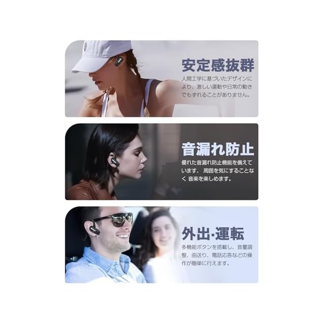 あらゆるシーンに最適な、頑丈で快適なデザイン:【落ちにくい】チタン合金メモリーフレームを採用し、耳にフィットする形状記憶設計で、ランニングや激しい運動でもズレにくい仕様。【生活防水】防汗防水により、トレーニング時の汗や突然の雨にも対応。【万能対応デザイン】軽量ながらも耐久性に優れ、日常使いからアウトドアまで安心して使用できます。また、耳を塞がない開放型設計のため、運転中や自転車通勤時でも周囲の音を確認可能。「1台で通勤・運動・仕事・日常すべてをカバー」 する、マルチシーン対応の万能イヤホンです。