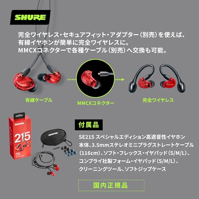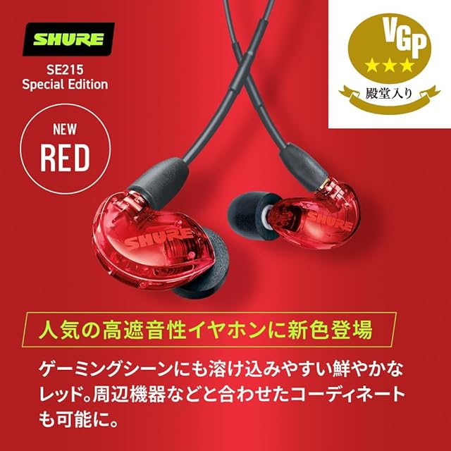 【VGP 殿堂入り金賞】SHURE シュア イヤホン 有線 SE215SPE-RD-A レッド 高遮音性 ノイズキャンセリング ゲーム ゲーミング スペシャルエディション カナル型 ワイヤレス変換可(別売) MMCX リケーブル プロ仕様 低音強化 配信 音楽 オーディオリスニング レコーディング 録音 楽器 在宅勤務 リモート ケーブル長116 cm 赤 RED 【国内正規品/メーカー2年】