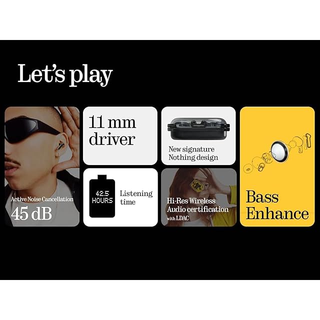 【最大45dBのノイズキャンセリング】最大45dBのノイズキャンセリングにより、現実逃避感が一段と向上。これまでで最も強力なノイズキャンセリングが、サウンドにさらに没入できる体験を提供します。Ear (2)と比べて13%向上した45dBのノイズキャンセリングにより、最大1.8倍のノイズ除去効果を実現。外部ノイズの大きさだけでなく、ノイズの種類にも対応できるようになりました。最大5000Hzの帯域幅をカバーし、耳障りな音を効果的に検知・低減します。