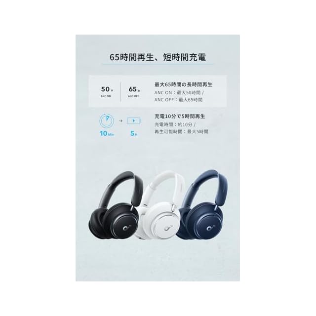 最大65時間再生・短時間充電:最大65時間の音楽再生が可能で、5分間の充電で約4時間の音楽を再生することができます (※再生可能時間は音楽再生時の時間であり、音量や使用環境によって異なります)。