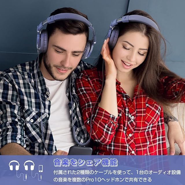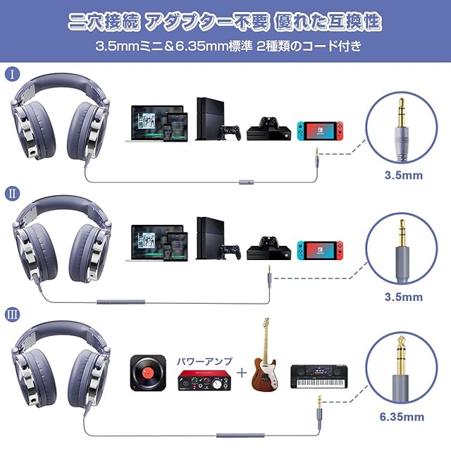 【二穴接続・音楽シェア】ヘッドホンの両側に6.35mmと3.5mmジャックが共存し、ケーブルも2本付属しております、1台の機器のステレオ音楽を複数の人と同時に楽しめる。楽器と接続した場合、パワーアンプによってヘッドホンの機能が最大限度まで再現可能。