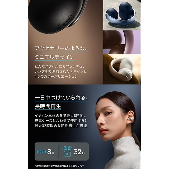 一日中つけていられる、長時間再生:イヤホン本体のみで最大8時間、充電ケースと合わせて使用すると最大32時間の長時間再生が可能。