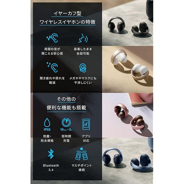 どんな耳でも快適な装着感:片耳約5.9gの小型軽量設計と、人間工学に基づく曲線デザインでストレスフリーなつけ心地を実現。装着感の調整が可能なイヤーカフキャップ付き。