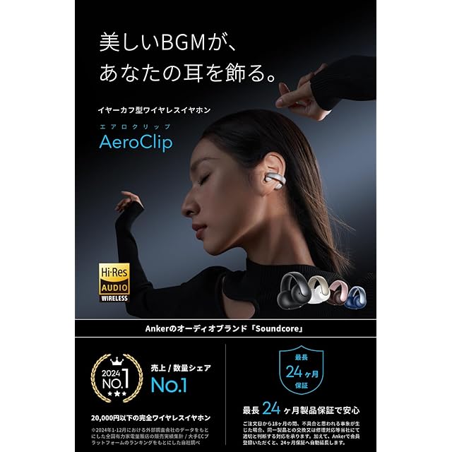 パッケージ内容:Soundcore AeroClip、充電ケース、イヤーカフキャップ (2種)、USB-C & USB-A ケーブル、技適マーク認証済み商品(周波数帯:2.40~2.48GHz)