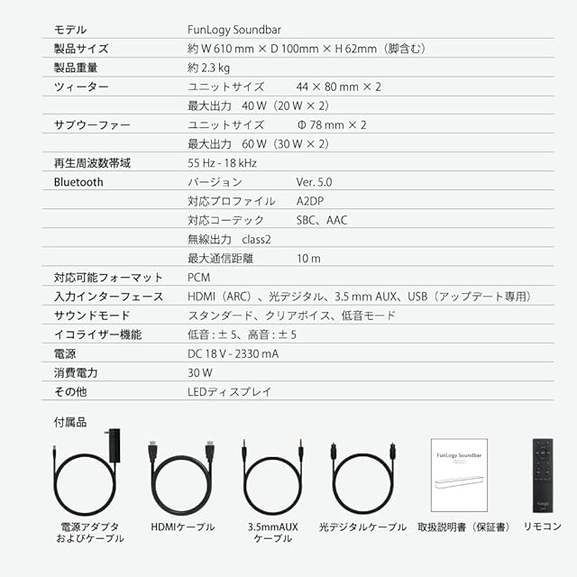 FUNLOGY Soundbar(スピーカー/サウンドバー)【VGP2024受賞 / Bluetooth対応/テレビ用/スマホ/ワイヤレス/ホームシアター/ARC/HDMI ケーブル付属/日本ブランド】 (ホワイト)