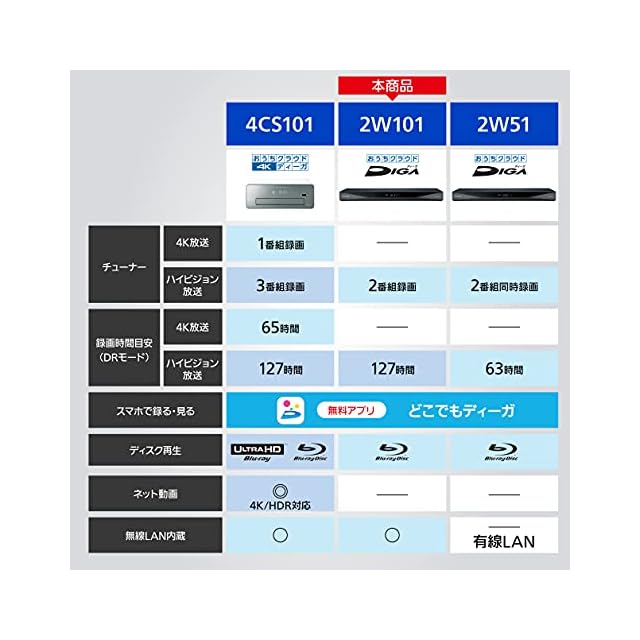 商品内容:2) 【DMR-2W101】2番組同時録画 / 1TB(最大約1,350時間)