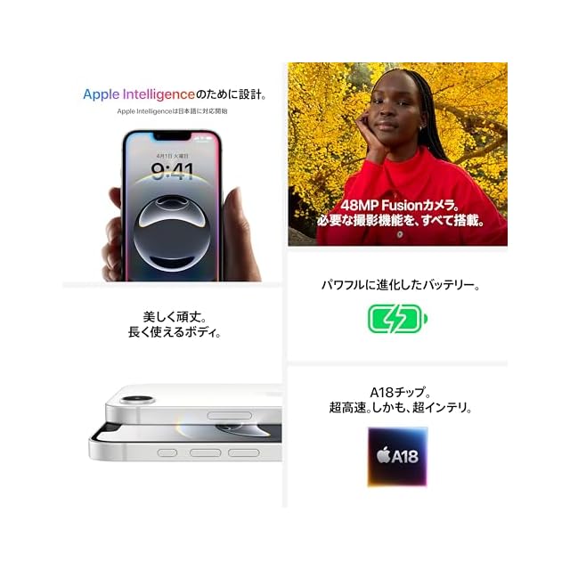 A18 チップ。未来対応のスピード A18 チップは Apple Intelligence やゲーム体験に パワーをもたらします。iOS の定期的なアップデートにも対応するので、長年にわたっ て iPhone を新しい状態で使えます。