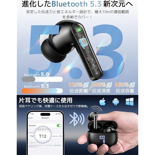 【最新進化版Bluetooth5.3チップでストレスフリー!】安定接続を実現するBluetooth 5.3高性能チップを採用したワイヤレスイヤホン。従来バージョンより省電力性・接続安定性が向上し、音切れしにくい設計。混雑した環境でも快適な高音質音楽体験が可能です。バッテリー消費を抑えるため、通勤・通学・長距離移動にも最適。外出時はもちろん、在宅勤務やオンライン会議中も安定接続を維持し、途切れないストレスフリーな使用感を実現!業界トップクラスのBluetooth 5.3&AAC/SBCコーデック対応で、iPhoneからAndroidまであらゆるデバイスで、没入感のあるサウンドをお楽しみいただけます。⚡【面倒ゼロの自動ペアリング機能】ケースからイヤホンを取り出すだけで即接続!イヤホン bluetooth の煩わしい設定作業とはお別れです。初期設定1回限りで、次回以降は電源ONするだけで0.68秒即認識!即接続・即通話も可能。