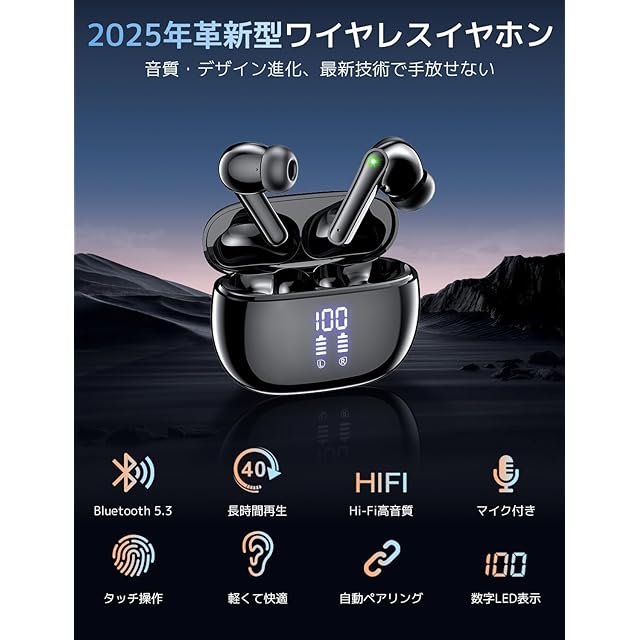 【2025年新発売モデル】年明け超人気の進化型ワイヤレスイヤホン再登場!業界トップクラスBluetooth 5.3チップ&プロ級チューニングを継承しつつ、通話性能と充電効率も劇的改善!ケーブル解放のオシャレ設計はそのままに、進化を手に。【ENCノイズキャンセリング性能】最大35dBノイズ低減の高性能ぶるーとゅーす イヤホンは、街中騒音・電車雑音をカット。低遅延通話とゲーム時の方向知覚に優れ、リモート会議でも明晰な音声を実現。イヤホン bluetooth ならではのノイズリダクション技術で、あらゆる環境で音楽世界に没入可能!【大口径ドライバーで実現するHIFI音質】大口径振動ユニット搭載により、音楽の生々しさ・艶を細部まで再現し、高精細サウンドを維持。【音の一瞬を、刻みこむ】深みある重低音は波紋のように広がり、透徹高音は花火の昇華を再現!映画鑑賞時の空間表現力やライブの臨場感を感動的に体感できて、動的な音の世界へ誘います。