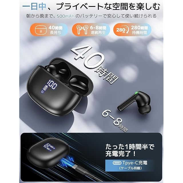 【フィット感にこだわった独自設計&全指向性マイク】人間工学に基づく耳穴構造設計のワイヤレスイヤホンは、ピタリと快適フィットを実現。片耳4.3gの超軽量設計で、長時間着用でも疲れ知らず!カナル型の高遮音性で外れにくく、ジムトレーニングに最適。周囲を気にせず没入型音楽体験が可能です。充電ケース39.8gのコンパクトサイズで荷物をかさばらなく、ポケット収納もOK。3サイズ(S/M/L)イヤーチップ付属で、サイズ/角度調節によりあらゆる耳形状に快適着用できます。独自開発シリコン素材の柔らかさで、横向き就寝時も耳圧迫ほぼゼロ。360°カバー全指向性マイク搭載のBluetoothイヤホンは、明瞭な通話品質と効果音収録を両立。ノイズキャンセリング技術を加えて不要雑音を大幅カット!ブルートゥースイヤホンな高感度マイクではの高精度音声認識を、通勤中やリモート会議で活かせます。Bluetooth接続でも安定動作し、多様なシーンで活躍する高性能イヤホン bluetoothです。