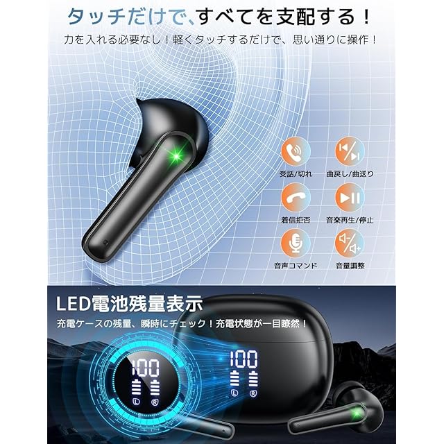 圧倒的コスパの完全ワイヤレスイヤホンが、低遅延・高音質で音楽の核心を捉え、没入体現逃すな!【高感度タッチ操作】感度抜群のタッチセンサー搭載で、スマホでの操作不要!音楽再生/停止や通話操作がワンタッチで可能。イヤホン軽くタッチ時の「タッ」という反応が使い心地の良さを実感させます。完全ワイヤレス設計だから片耳/両耳使い分け自由。音楽は両耳で没入、通話は片耳で周囲確認とシーン別活用が魅力!【生活防水で運動時も安心】汗防水性能を備えたイヤホン ワイヤレス は、突然の雨やトレーニング中の汗も防ぐ。ジムやランニングなどスポーツシーンでもお気軽に。【365日安心のアフターサービス】商品に不具合があれば注文履歴から対応!ブルートゥースイヤホンの対応も万全。お客様の「困った」を最速で解決する強力サポート!