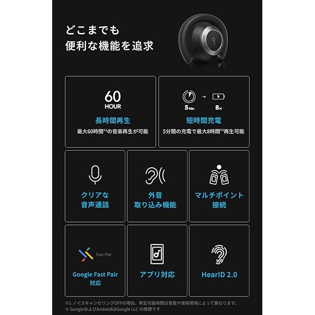 パッケージ内容:本体、3.5mm AUXケーブル、トラベルポーチ、USB-C & USB-A ケーブル、クイックスタートガイド、技適マーク認証済み商品(周波数帯:2.40~2.48GHz)