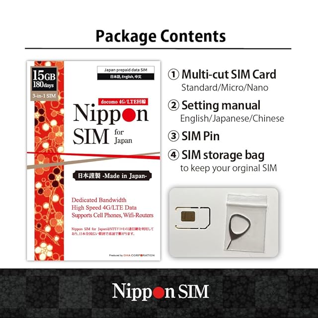 プリペイドsim 日本 simカード 180日間 15GB sim ドコモ通信網 docomo データ通信専用 4G LTE 3in1 (標準/マイクロ/ナノ) simフリー 端末のみ対応 多言語マニュアル付【Nippon SIM for Japan】