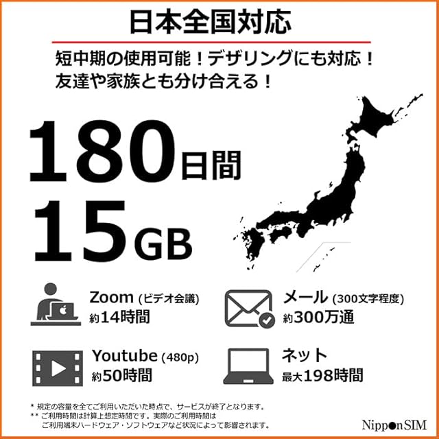 【最終利用開始日:購入後6か月以内】日本国内で使用する場合は技適マークが付された端末で使用してください。※利用期限までにご利用を開始するようお願いします。利用期限を過ぎるとご利用できなくなります。(利用期間:SIMカードを差し込んで設定後、初めてデータ通信を行った日から180日間。)Please start using the SIM before the expiry date printed on package in order to enjoy the full duration.