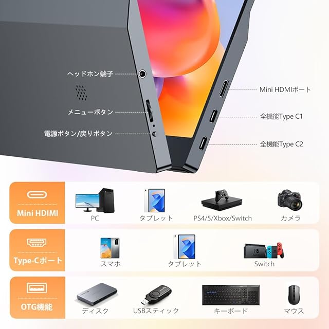 ✅【豊富な接続端子|幅広いデバイスと互換】フル機能USB Type-Cポート×2、Mini HDMI、3.5mmイヤホンジャックを搭載し、ノートPC、スマホ、ゲーム機(Switch/PS5など)、カメラ、タブレット、Fire TV Stick、工業機器など多種多様なデバイスに対応。ケーブル1本で映像・音声・給電・タッチ操作が可能なシンプル設計。追加ドライバ不要で、接続してすぐ使える即戦力モニターです。 【注意事項】①:本製品は1本で接続できます。⚠1本接続できない場合は電源不足が原因で、付属の電源とケーブルの使用して電源供給をお勧めします。電源仕様は5V3Aです。②:直接に接続の端末から電源を取る場合、端末の電力低下で、高輝度などを維持できなくなり、給電不足によるちらつきや表示不安定が発生する可能性があります。この場合、アダプターで給電してください。③:タッチ機能を使用したい場合は、HDMI接続時はもう一本USB-Cケーブルでモニターとデバイスを接続必要です。