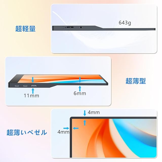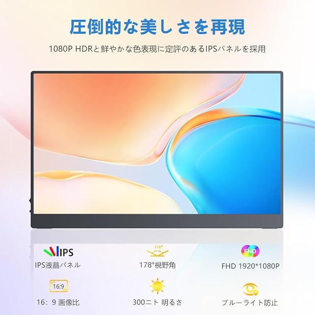 ✅【15.6インチFHD|高画質&持ち運びやすさを両立】画面解像度はフル HD(1920×1080)で、在宅ワークや動画視聴にもぴったり!178°視野角により上下左右から自然な色合いを表示できるIPS液晶パネルを採用、より広い範囲で見ても鮮やかな映像をみることが可能。本体重量はわずか約643gと軽量で、耐久性と重量のバランスが良く取れています!上と左右のベゼルはわずかの5mm、画面占有率は実に約90%とほぼフレームレスを実現している!携帯性と機能性に優れており、外出先でも簡単にマルチモニター環境を構築でき、生産性の向上とワークスタイルの多様化を実現します。