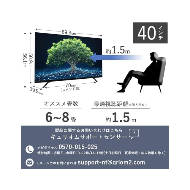 ✅【商品仕様】◇本体寸法:[スタンドなし]893×82×509mm [スタンドつき]893×199×561mm ◇本体質量:[スタンドなし]5.5kg [スタンドつき]5.6kg ◇画面サイズ:40V型 ◇解像度:1920×1080 ◇コントラスト比:5000:1 ◇アスペクト比:16:9 ◇視野角:H/178°V/178°(標準値) ◇フレームレート:60fps ◇最大スピーカー出力:6W+6W ◇Bluetoothバージョン:5.0 ◇無線LAN:2.4Hz/5GHz ◇壁掛け寸法:VESA規格200×200 ◇付属品:スタンド×2(ネジ4本含む)、リモコン(動作確認要単4形乾電池2本含む)、取扱説明書、書、専用AVケーブル、VESAネジ×2(ST4×10mm・下側用)