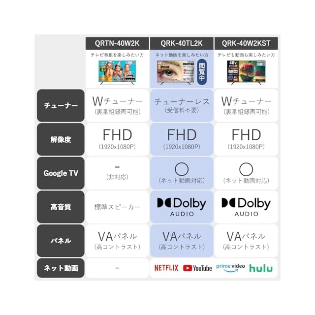 ✅【チューナーレステレビ】「地上波などのテレビ番組は見なくなった」「YouTubeやNETFLIX、primevieoなどをスマホで見てる」そんな方へオススメ、アンテナ接続不要のGoogle TV搭載チューナーレステレビ。豊富なVOD(動画配信サービス)に対応しているので、お好きなコンテンツを思いのままに、大画面で楽しめます。本製品には地上波、BS/110℃Sのチューナーは付いておりません。地上波、BS/110℃Sをご覧になる時は別途外付けのチューナーが必要です。