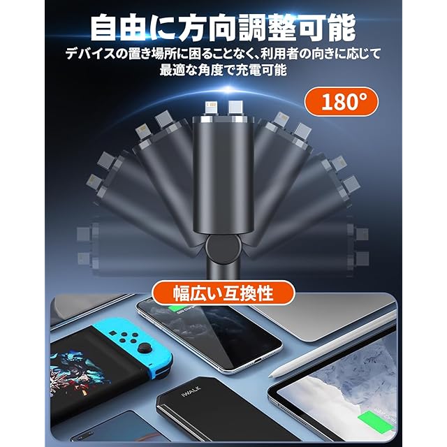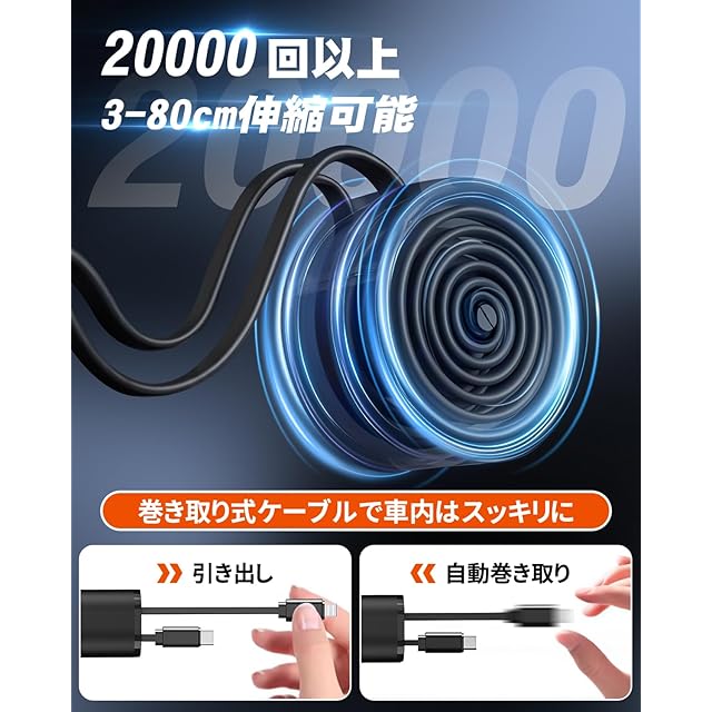 【巻き取り式・自由に方向調整可能】巻き取り式充電ケーブル は3cmから80cmまで自在に伸縮でき、前後座席の方々も快適に充電が可能です。車 充電器は 180 度調整可能で、デバイスの置き場所に困ることなく、最適な角度で充電が可能です。【安定性高い】シガーソケットはどんなにひどい道でも安全で安定した充電が可能で旅の途中でケーブルが緩んだり充電が中断したりする心配はもうありません。