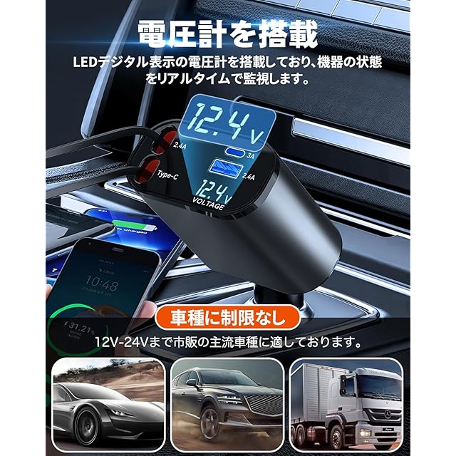 【電圧計を搭載 安全保障】シガーソケット にはLEDデジタル表示の電圧計を搭載しており、車のバッテリー状態をリアルタイムで監視することができます。過電流保護、高温保護、過電圧保護、短絡保護、過充電保護など安全保障も付き安心に運転できます。【メーカー】こちらの製品は厳しい品質検査を行った。万が一商品に何か問題がある場合、最善のアフターサービスを提供致します。ご疑問があれば、いつもお気軽にご連絡ください。