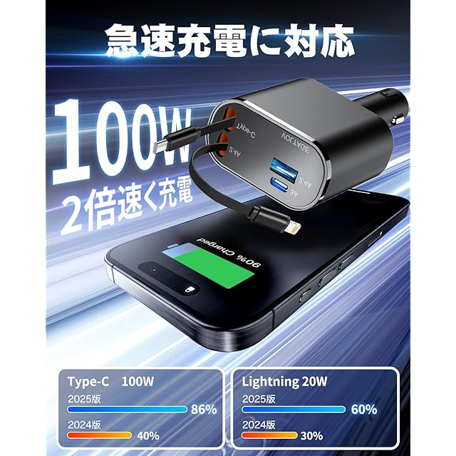 【車 充電器 急速充電対応】カーチャージャー には、Type-Cケーブルでの急速充電は最大100W、Lightningケーブルでの急速充電は最大20Wとなります。iPhone 16 Pro Max、iPhone 16 Plus など最新のシリーズの高速充電に適しています。車 充電器 の高効率な電力分配により、全てのデバイスが充電中に常に十分な電力を保つことができ、充電速度が低下しません。