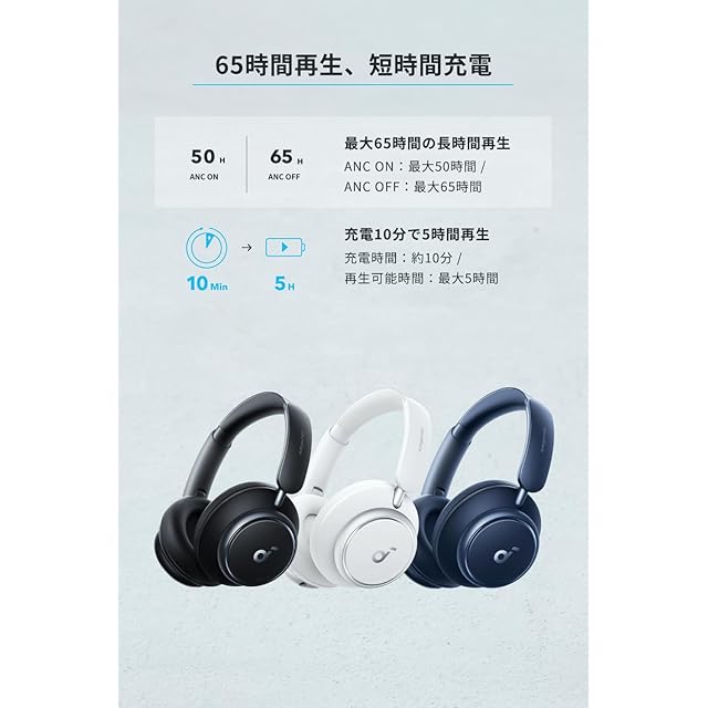 最大65時間再生・短時間充電:最大65時間の音楽再生が可能で、5分間の充電で約4時間の音楽を再生することができます (※再生可能時間は音楽再生時の時間であり、音量や使用環境によって異なります)。