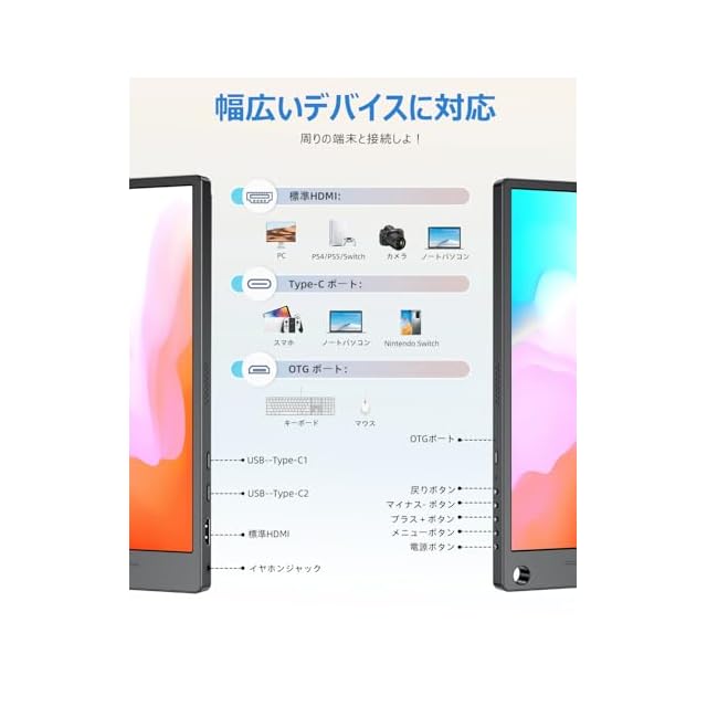 【幅広く接続に対応】パソコン モバイルモニターの接続端子には汎用性の高いみに標準HDMI・USB Type-Cの2種類を搭載します。インターフェイスが豊富なので、新しいデバイスなら問題なく対応できます。USB Type-C端子はMacBookやSurfaceに加えて、最新のiPad ProやAndroidスマホにも搭載されており、Type-Cの1つは本体の充電用に使われますが、変換ケーブルを介さずにさまざまなデバイスが使用できるのが魅力です。また、マウスやキーボードを接続できるOTGポート(microUSB)も備えています。ケーブル等が付属品に入っていて、追加での購入の必要がないです。