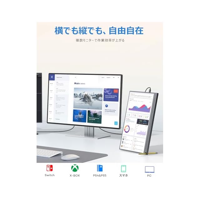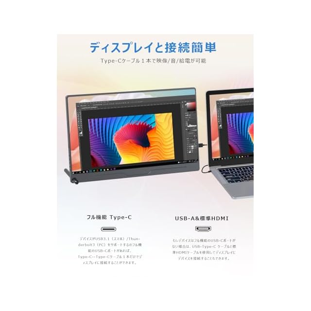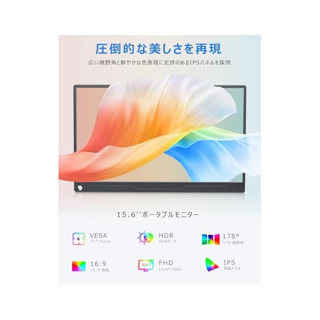 【15.6インチ大画面フルHD&HDRモード】モバイル モニターの画面解像度はゲーム、動画視聴や事務作業に最適な迫力の15.6インチ大画面フル HD(1920×1080)です。上下178°、左右178°の広い範囲で一定の視認性が得られる自然な色合いを表示できるIPS液晶パネルを採用して、どの角度から見ても鮮やかな映像をみることが可能です。HDR表示対応しているので、PS4ゲームなどのHDRコンテンツも美しい色彩描写を最大限に発揮して楽しめます。ポータブルデイスプレイは拡張モード・複製モードを対応の上、横表示はもちろん、縦置きでも簡単にスタンドできます。ご注意:スマホ接続時は縦設置フル画面表示できない、ご了承ください。
