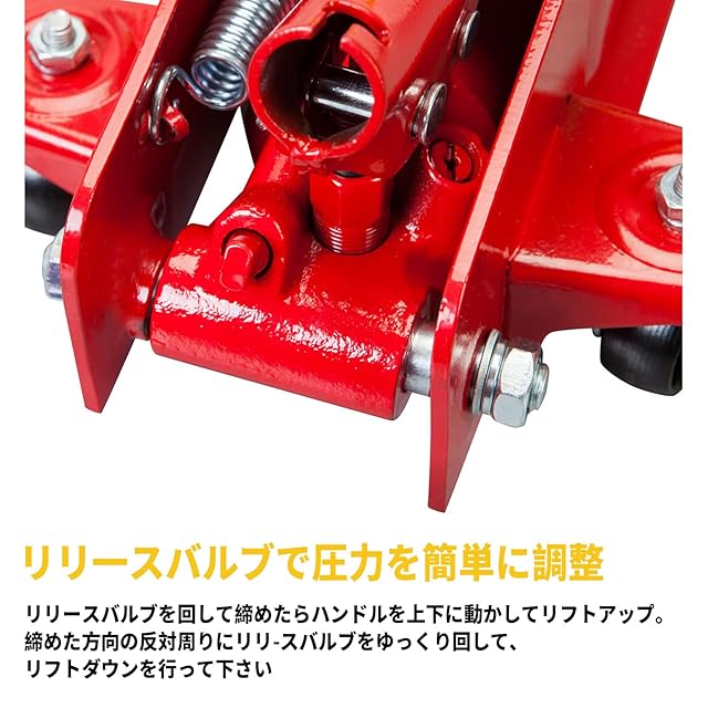【使用簡単】ハンドルをリリースパルブに差し込み、時計回りに締めつけ、上下にポンピングし、ジャッキアップできます。リリースパルブを反時計回りにゆっくり回し、ジャッキダウンします