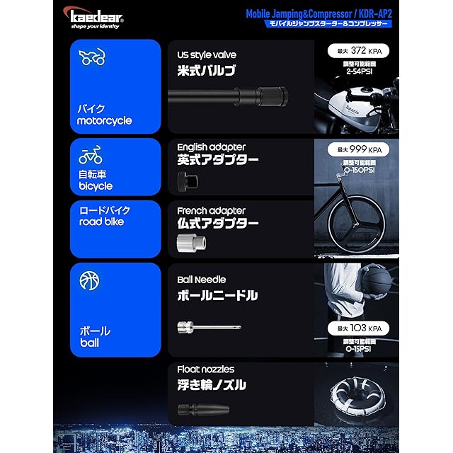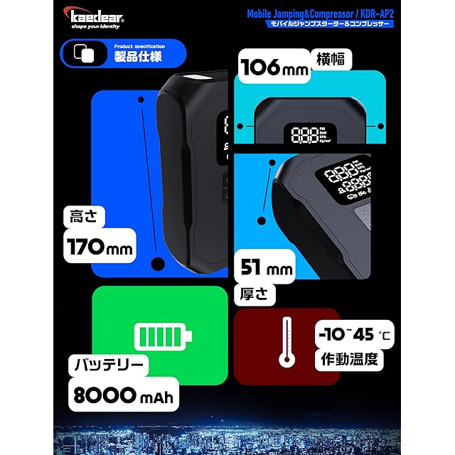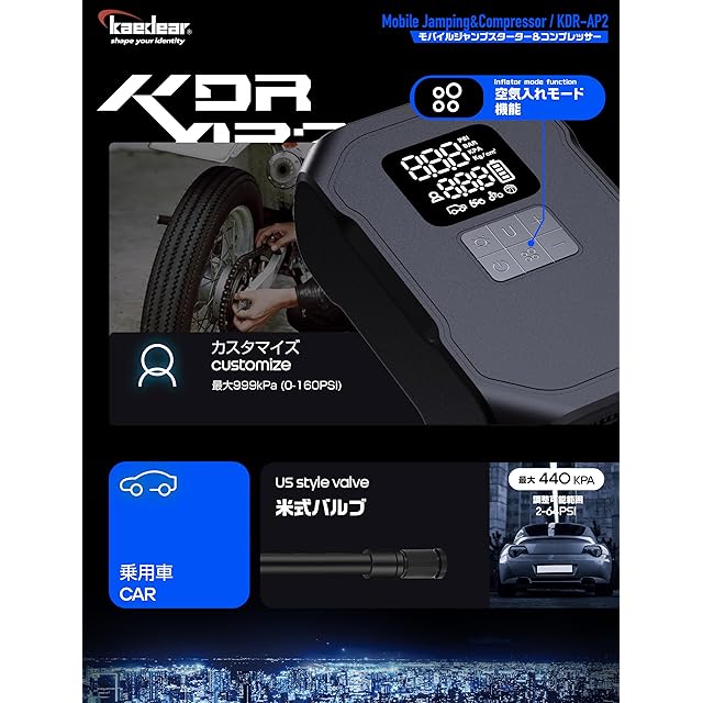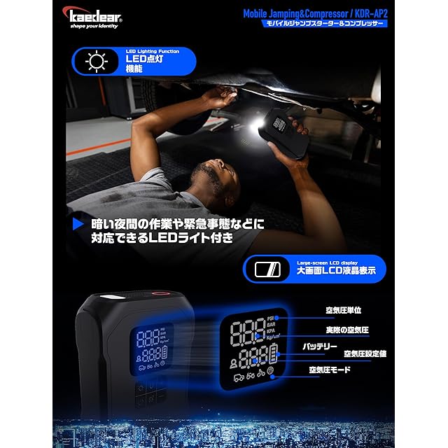 商品名:Kaedear(カエディア) バイク ジャンプスターター 空気入れ バイク用 エアポンプ エンジン始動 電動 エアーポンプ 電動空気入れ 充電式 usb充電器 8000mah ~999KPA 28L/分 最大始動電流1000A typeC オートバイ 自転車 車 ジャンピング&コンプレッサー KDR-AP2 (KDR-AP2)