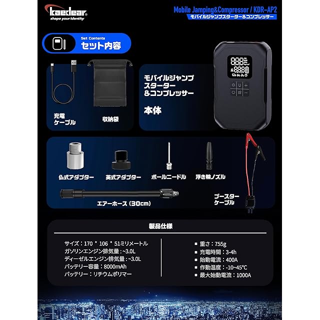 【商品内容】 ジャンピング&コンプレッサー本体、エアーホース30cm(米式バルブ)、ブースターケーブル、仏式バルブアダプター、英式バルブアダプター、ボールニードル、浮き輪ノズル、充電ケーブル、収納袋 ■取扱説明書(オンラインのみ):環境負荷の軽減を目指した脱炭素化への取り組みとして、紙媒体での同封を控えさせていただいております。Kaedear公式サイトの各商品ページから閲覧またはダウンロードが可能です。