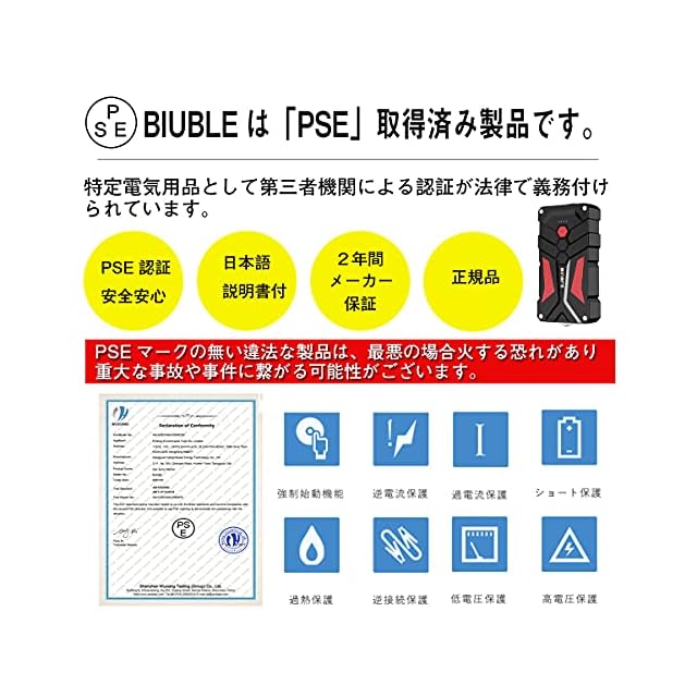 【安全保護&PSE認証】PSE認証(証明書番号:WUX202012155200PSC)商品で、高品質のリチウムバッテリーおよびスマートクランプによる回路保護機能は安全性能を随分アップします。操作不当による短絡/逆接続/過放電/過電流/逆電流/逆極性/過充電が発生の時、声と光のアラームが起こし、安全保護を提供します。【スーパー保護機能】ジャンプスターターは安全性の高いリチウム電池を採用したもので、さらにスマートクランプが配置されており、逆充電保護・短絡保護・過熱保護・過充電保護・過電流保護・過放電保護・逆接続保護・逆極性保護など、計8種類の保護機能を搭載し、初心者の方も安心に使えます。