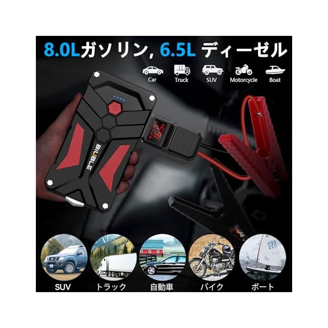 【12V車用ジャンプスターター】26800mAhの大容量、7000Aのピーク電流で、すべてのガソリン・8L以下のディーゼル12V車両に対応しております、本製品が満タンの場合にはエンジンを60回連続に始動させることができます、エンジンがかからない悩みはこれから心配無用です。車だけではなくオートバイ、モーターボート、軽トラなどにも適用です!