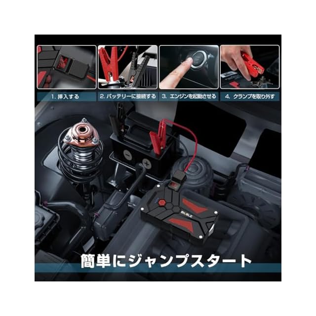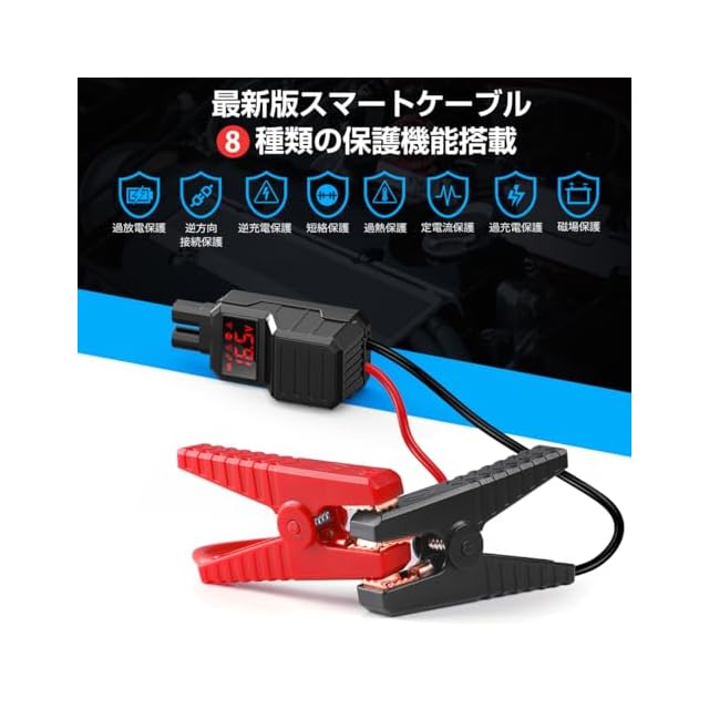 【安全保護&PSE認証】PSE認証済み(証明書番号:WUX202204251788PS)商品で、高品質のリチウムバッテリーおよびスマートクランプによる回路保護機能は安全性能を随分アップします。操作不当による短絡/逆接続/過放電/過電流/逆電流/逆極性/過充電が発生の時、声と光のアラームが起こし、安全保護を提供します。【スーパー保護機能】ジャンプスターターは安全性の高いリチウム電池を採用したもので、さらにスマートクランプが配置されており、逆充電保護・短絡保護・過熱保護・過充電保護・過電流保護・過放電保護・逆接続保護・逆極性保護など、計8種類の保護機能を搭載し、初心者の方も安心に使えます。