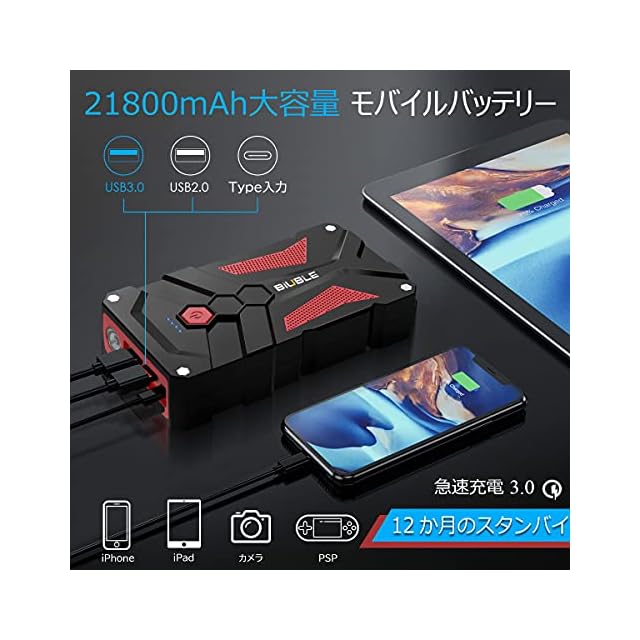 BIUBLE ジャンプスターター 21800mAh大容量 6000Aピーク電流 (最大8.0Lガソリン・6.5Lディーゼル車対応) 12V 車用エンジンスターター 車緊急始動 モバイルバッテリー機能 LEDライト搭載