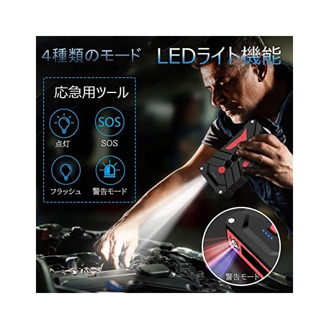 【緊急時にも安心】ジャンプスタートに限らず、LEDライトでもあります。照明、SOS、ストロボと警告灯四つのモードがあります。高輝度ライトで、暗いなか車内でのお探し物、作業等に便利です。アウトドア、緊急事態のヘルプ信号、夜間の緊急照明に、様々なシーンで活躍できます。