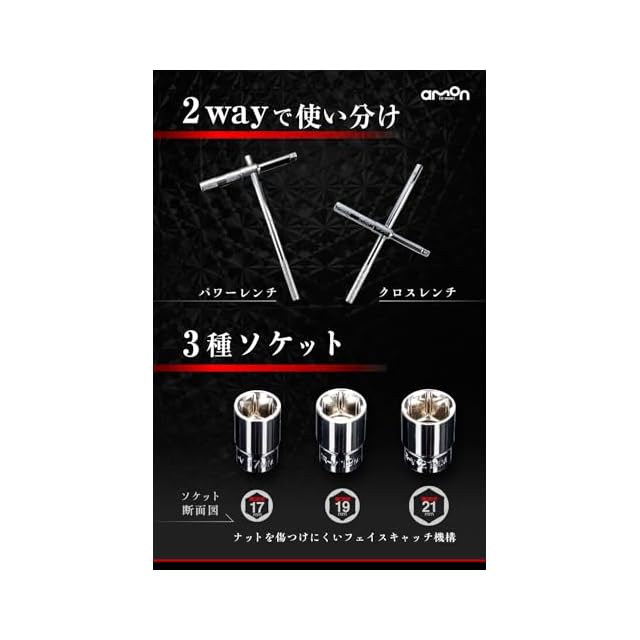 3種類のソケット付属。薄口形状でアルミホイールにも対応。