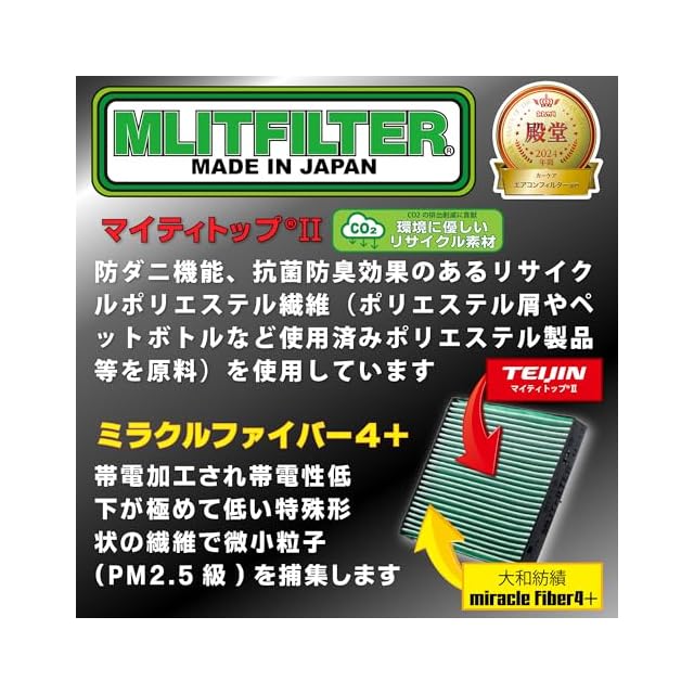 圧倒的な繊維量、静電加工された「ダイワボウ製ミラクルファイバー」が細かな塵(PM2.5)や花粉を引き寄せます。