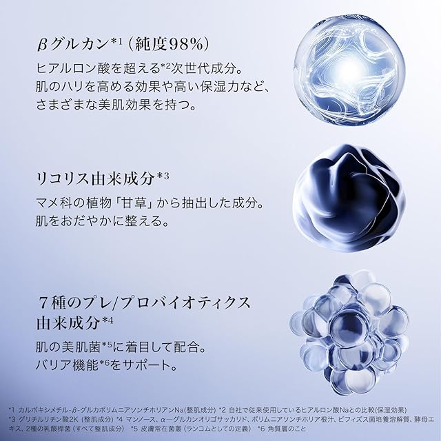 Product benefit: 回復科学から誕生。 ヒアルロン酸を超える*次世代成分「βグルカン**」を新配合で、強く美しい肌へ。 日本処方。 *自社で従来使用しているヒアルロン酸Naとの比較(保湿効果) **カルボキシメチル-β-グルカンNa (整肌成分)