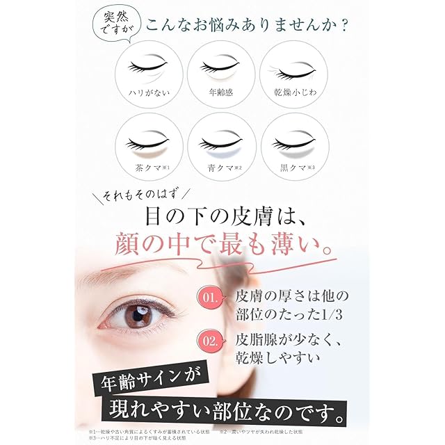 【目の下のお悩みのために】青クマ・黒クマ・茶クマのすべてに対応。 ※青クマ…潤いやツヤが失われ乾燥した状態、※茶クマ…乾燥や古い角質によるくすみが蓄積されている状態、※黒クマ…ハリ不足により目の下に年齢感ができることで暗く見える状態