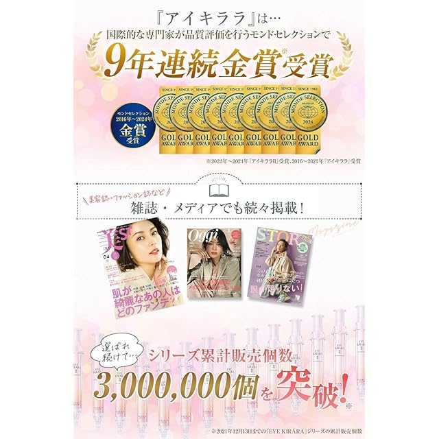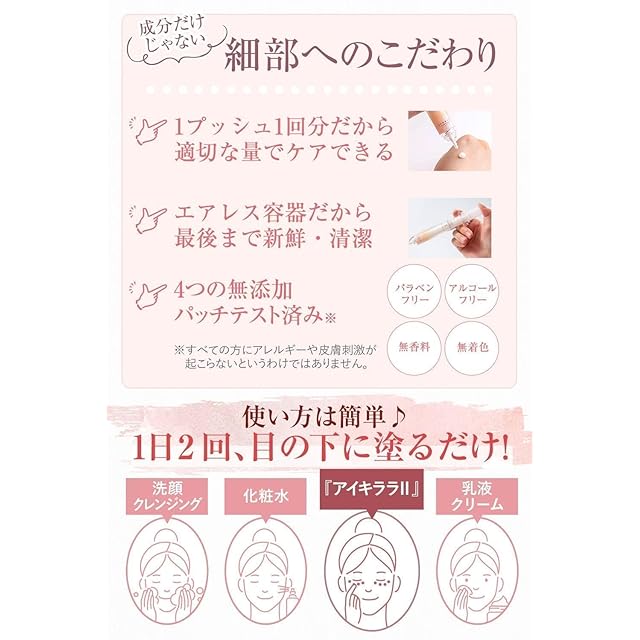 【成分】目の下にハリを与えるMGA*1、さらにMGAブースター*2 を配合。目の下ケアのために開発されたハロキシル*3、肌の柔軟性を保ち潤いを与える成分Kコンプレックス*4、さらにハリ・ツヤを与える成分レチノール誘導体*5も配合。馴染みやすいのが特徴で、角質層まで浸透します。 *1 1ミリスチル3-グリセリルアスコルビン酸、BG *2ココイル加水分解コラーゲンK(皮膚をすこやかに保つ成分) *3ステアレス-20、N-ヒドロキシコハク酸イミド、クリシン、パルミトイルトリペプチド-1、パルミトイルテトラペプチド-7 *4アンズ核油、カニナバラ果実油、アボカド油、ヒマワリ種子油、ナットウガム *5パルミチン酸レチノール