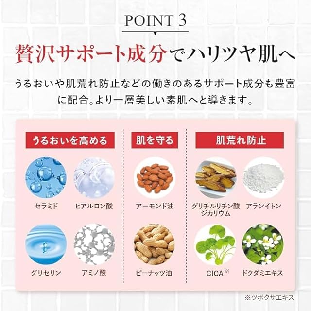 ✨毛穴の目立ちが使うほどに軽減:ピーリング系の洗浄成分が毛穴の詰まりを溶かし排出し、同時に引き締め効果の高い「アーチチョーク葉エキス」を配合し、毛穴の目立ちをケアします。 ✨黒ずみの発生を軽減:レチノール*やフルーツ酸には皮脂抑制効果もあり、落とすと抑制の相互作用で黒ずみを予防します。* パルミチン酸レチノール