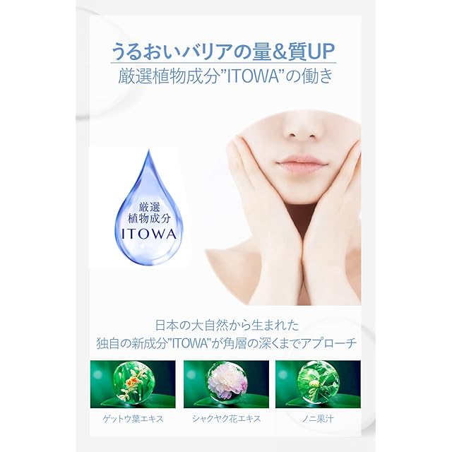日本の大自然から生まれた独自成分「ITOWA」配合。和漢植物をはじめとした植物由来成分を贅沢につめこみ、うるおいバリアの量と質を上げることで肌あれを防ぎ、環境トラブルにも負けない、健やかな肌を保ちます。