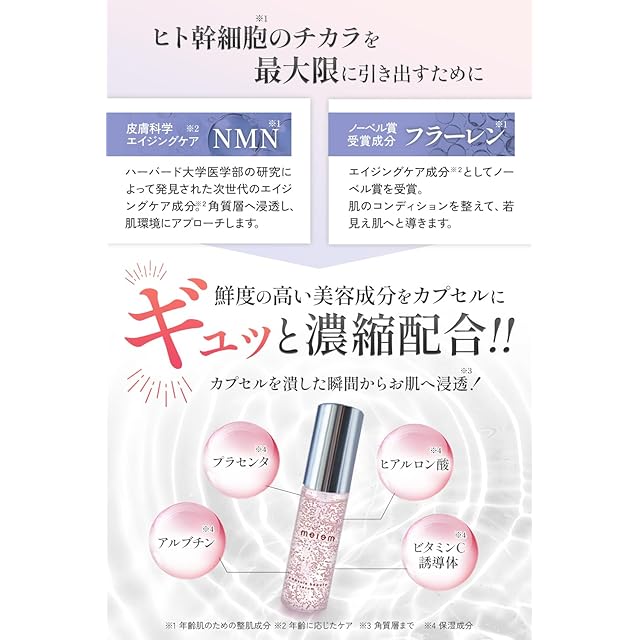 ✨美しさ引き出す次世代スキンケア:ヒト幹細胞培養液*1やNMN*1、フラーレン*1、ビタミンC誘導体*2、ヒアルロン酸*2などの美容成分をカプセルにギュッと濃縮配合。鮮度を保ち、カプセルを潰した瞬間からお肌に浸透*3します。「もっと早くケアすれば良かった」と後悔しないために、お肌の年齢サインに気づいた今日からmelemのヒト幹細胞*1カプセル美容液で次世代エイジングケア*4をはじめてみませんか。 *1 年齢肌のための整肌成分 *2 保湿成分 *3 角質層まで *4 年齢に応じたケア