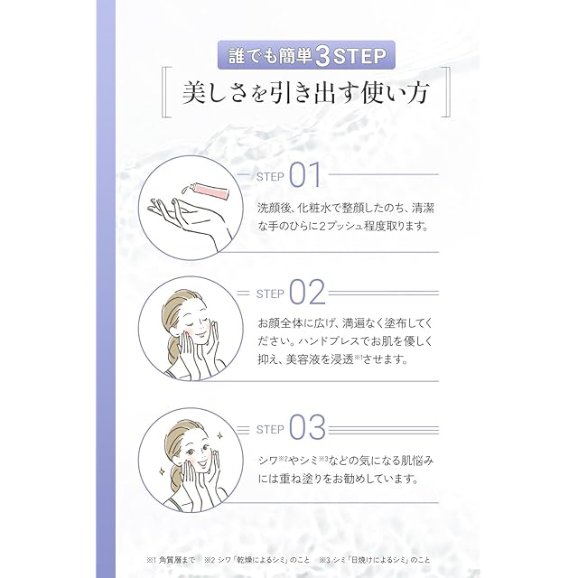 ✨誰でも簡単3STEP:①洗顔後、化粧水で整顔したのち、清潔な手のひらに2プッシュ程度取ります。②お顔全体に広げ、満遍なく塗布してください。ハンドプレスでお肌を優しく抑え、美容液を浸透*1させます。③シワ*2やシミ*3などの気になる肌悩みには重ね塗りをお勧めしています。*1 角質層まで *2 乾燥によるシワのこと *3 日焼けによるシミのこと
