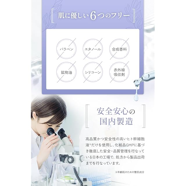 ✨安全安心の国内製造:高品質かつ安全性の高いヒト幹細胞液*だけを使用し、化粧品GMPに基づき徹底した安全・品質管理を行っている日本の工場で、処方から製品出荷までを行っています。* 年齢肌のための整肌成分