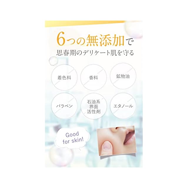 【優しさにもこだわった無添加処方】思春期のデリケートなお肌を守るため、着色料・香料・鉱物油・パラベン・石油系界面活性剤・エタノールは不使用です。